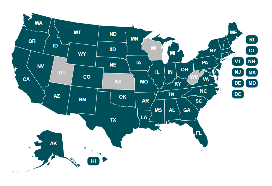 Alabama – Alaska – Arizona – Arkansas – California – Colorado – Connecticut – Delaware – Florida – Georgia – Hawaii – Idaho – Illinois – Indiana – Iowa – Kentucky – Louisiana – Maine – Maryland – Massachusetts – Michigan – Minnesota – Mississippi – Missouri – Montana – Nebraska – Nevada – New Hampshire – New Jersey – New Mexico – New York – North Carolina – North Dakota – Ohio – Oklahoma – Oregon – Pennsylvania – Rhode Island – South Carolina – South Dakota – Tennessee – Texas – Vermont – Virginia – Washington – Washington D.C. – Wyoming